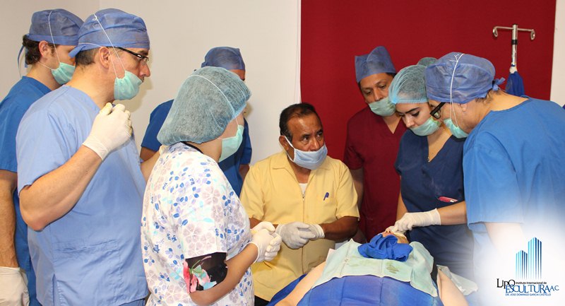 El Médico Militar José Domingo García Castillo compartiendo con sus alumnos la técnica de lipoinjerto en cara, concluyendo el curso de la 12va. Generación del Diplomado en Lipoescultura.